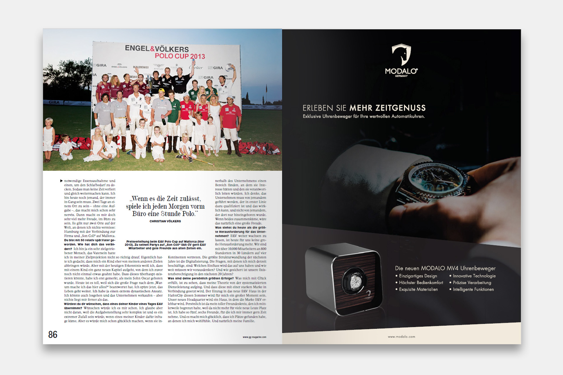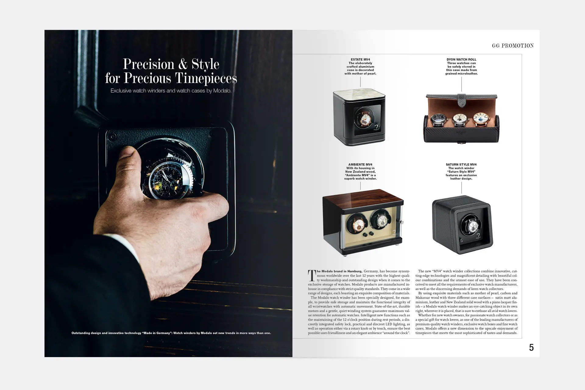 Das GG Magazin bietet Unterhaltung auf höchstem Niveau. Der Leser erhält Einblicke in Luxustrends aus aller Welt, mit dem Fokus auf Real Estate, Architektur, Design, Fashion, Yachting, Luxury Travel und Lifestyle. Ein perfektes Umfeld für die Vorstellung der neuen MODALO Uhrenbeweger und Uhrenrollen.