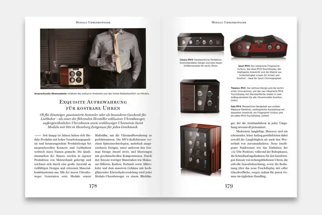 Im aktuellen Kompendium präsentiert die Marke MODALO die neuen Uhrenbeweger-Kollektionen CLASICO für 6 Uhren, SPORT für 4 Uhren, TIMELESS für 4 bis 6 Uhren und das Flaggschiff des Unternehmens, GALA für bis zu 12 Uhren.